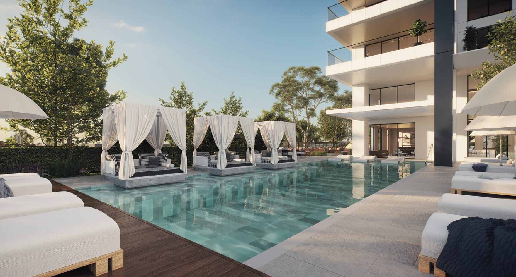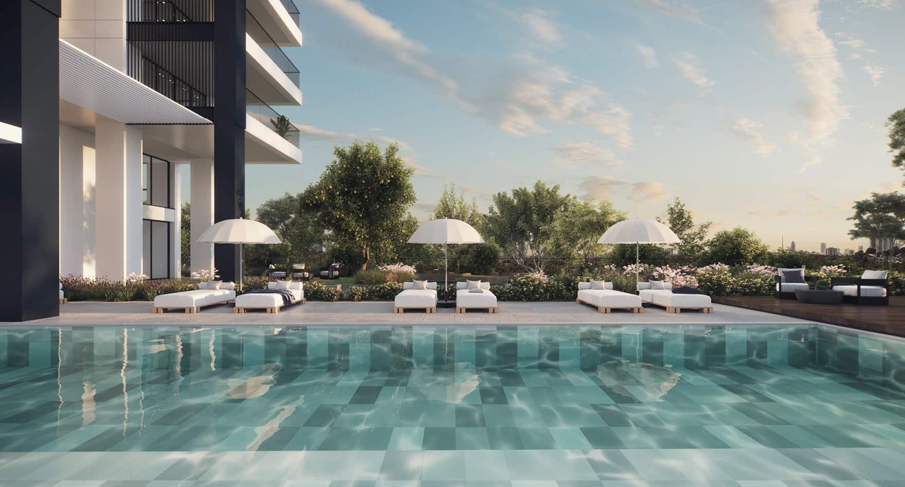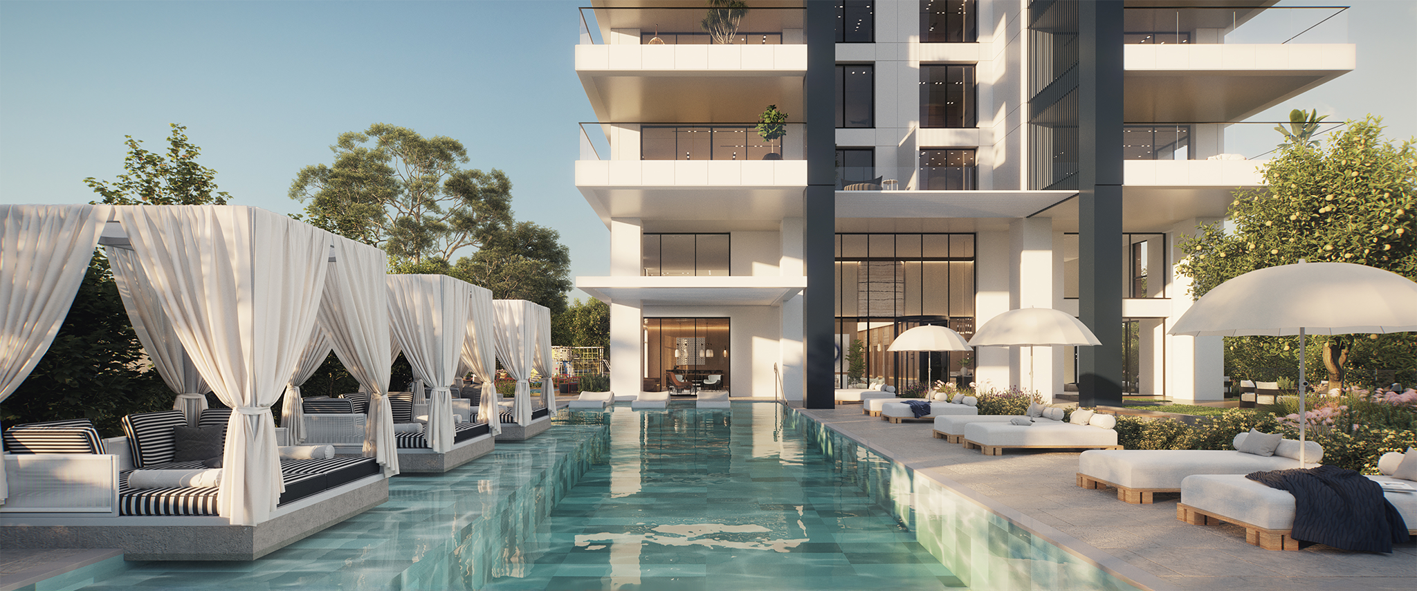 The lifestyle complex reads like a private club: an outdoor pool with a separate toddler pool, shaded seating areas, landscaped gardens, a spa complex, a fully equipped gym, a stylish residents’ lounge, and a premium business lounge for meetings, remote work, or simply getting things done without leaving the building. In the words of interior designer Oshir Asaban, “I was given a free hand to translate the feeling of a luxury resort into every detail, with no shortcuts or compromises.”